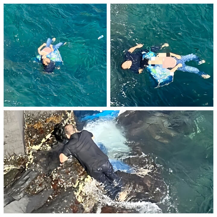 楊氏は意識を失い顔が下を向いた女性を仰向けにし、頭を袋に乗せて岸へ向かって泳いだ。しかし当日の波は1~2メートルの高さがあり、何度も沖へ押し戻された。体力が限界に近づく中、女性の髪を口でくわえ、両手で岩場にしがみつきながら約20分間耐え続けたという。