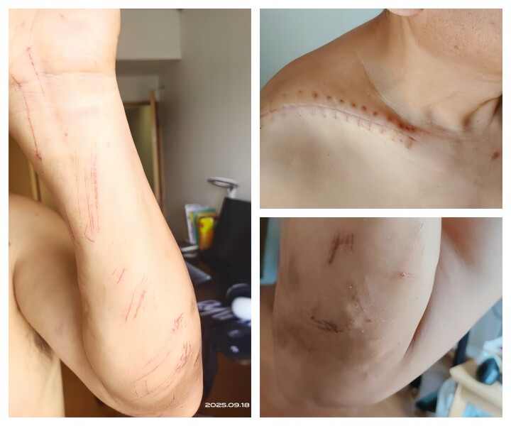 当時、左手に障害があり、右肩は鎖骨の手術から間もない状態だった楊氏だが、「下りなければ命が危ない」と決断。高さ30メートル以上、ほぼ垂直に近い崖を自力で下り、空のペットボトル入りの袋を浮具代わりに海へ飛び込んだ。